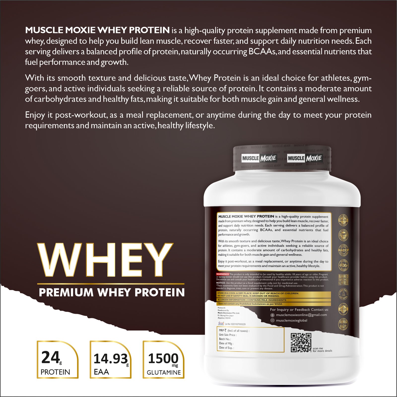 Fuel your fitness journey with Muscle Moxie Whey Protein Concentrate – a premium blend designed to support lean muscle growth, faster recovery, and everyday strength. Made from high-quality whey sourced from trusted dairies, this protein supplement delivers the essential building blocks your body needs after workouts or as a daily protein boost.